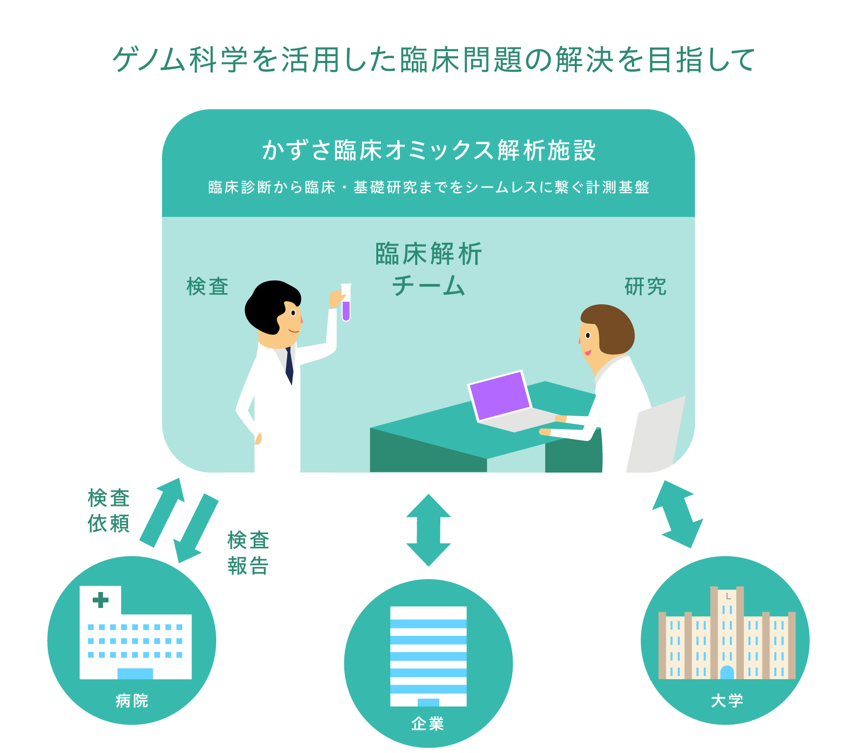 私たちは、千葉県内外の医療グループとの強い連携の下、10 年にわたって、さまざまな理由から「必要だけれども受け皿がない」臨床的検査に潜む技術的な問題を抽出・解決する経験を積んできました。こうした「現場」に求められるニーズを医療機関から日常的に直接学べるのは、私たちの大きな強みです。また、衛生検査所登録された検査室を設置し、社会実装の道筋も明らかになっています。そして、先端的なオミックス計測技術を活用して、臨床診断から臨床研究までを支援するワンストップ解析プラットフォームを提供する国内唯一の研究チームであることが最大の特徴です。
